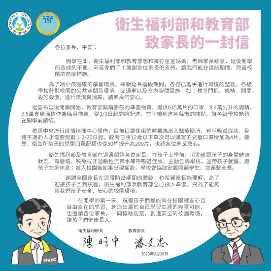 衛福部陳部長與教育部潘部長共同在開學前特別寫了一封信,感謝家長及學校共同協助防疫工作,並說明我們的防疫準備,邀請家長一同協助防疫,創造安全校園環境,讓孩子們健康長大。